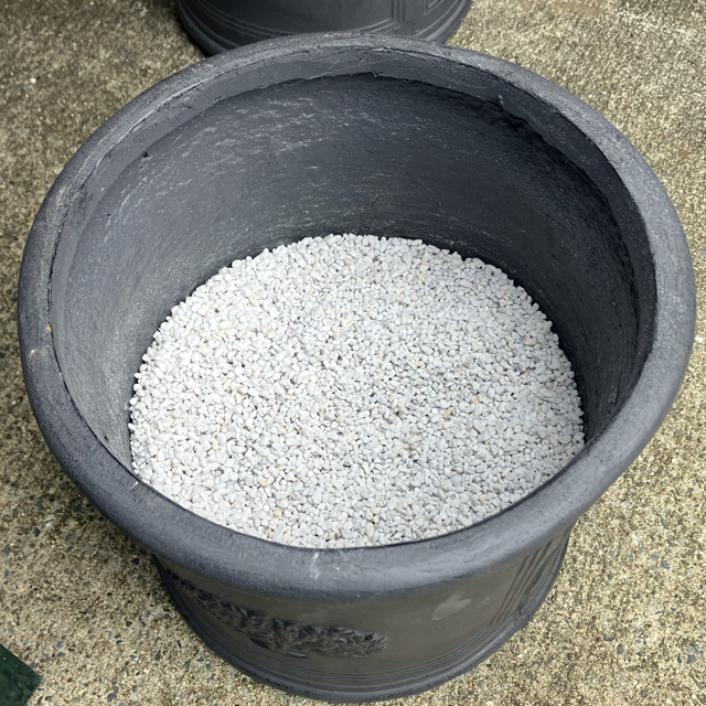 深鉢の底の部分にパーライトを入れました。これは土の水はけや通気性を良くします。植物の根が健全に育つ環境づくりにもとても良いです。この上にプランター培養土を入れます。