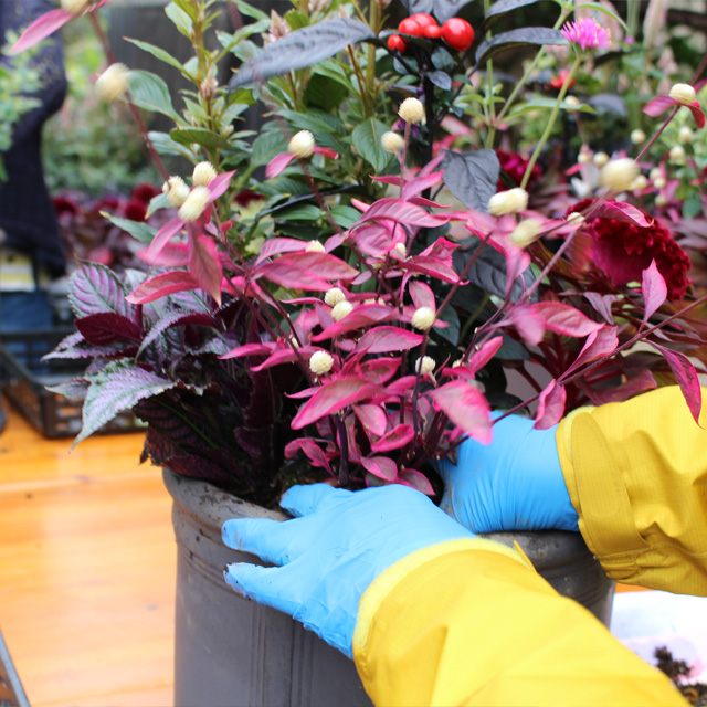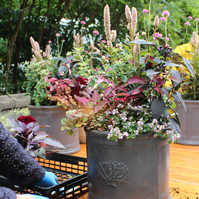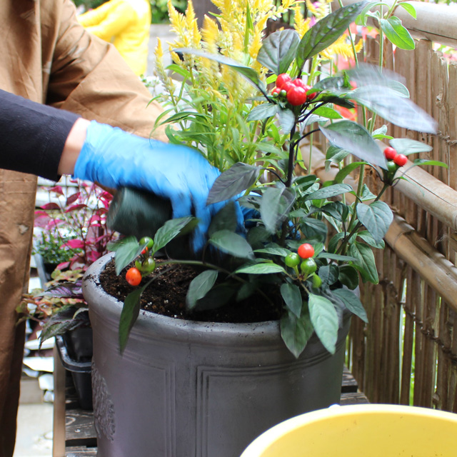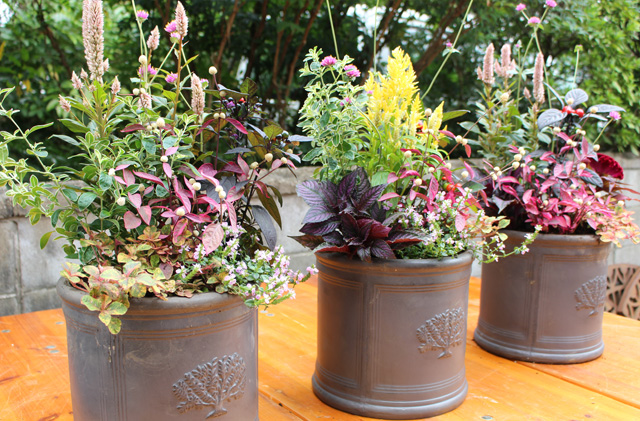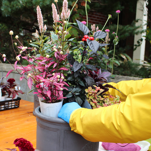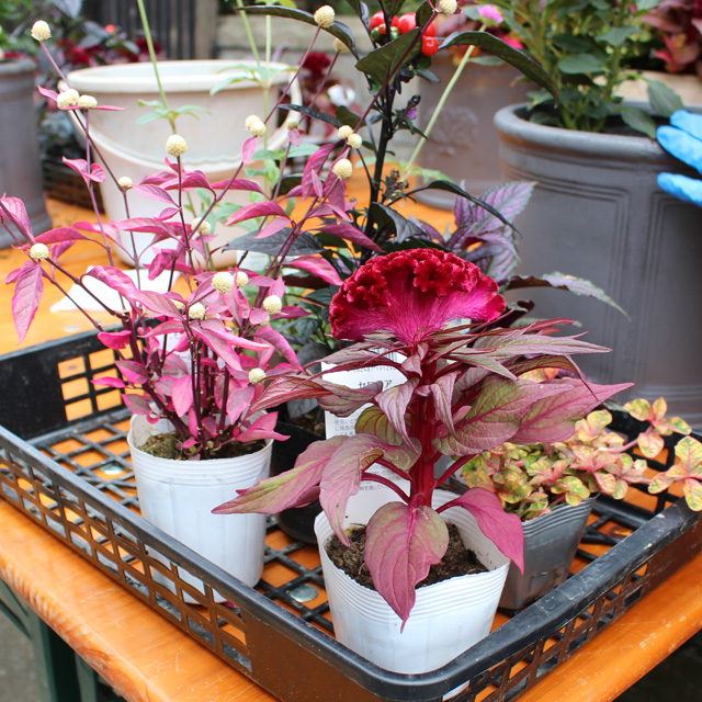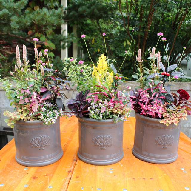 今回の深鉢は15周年記念プランターを用意しました。(ステキ!の声ありがとう!)秋の寄せ植えの花苗に新顔も登場しました。フロールコタキ、アルテルナンテラ、ピンクネックレス、サザンクロス、ハクチョウゲ、ファイヤーワークス、トウガラシ、セロシアドラキュラ、セロシアヴィンテージ、ケイトウセンチュリー、などの花苗から好きな組み合わせ6〜7鉢を選んで作りました。
